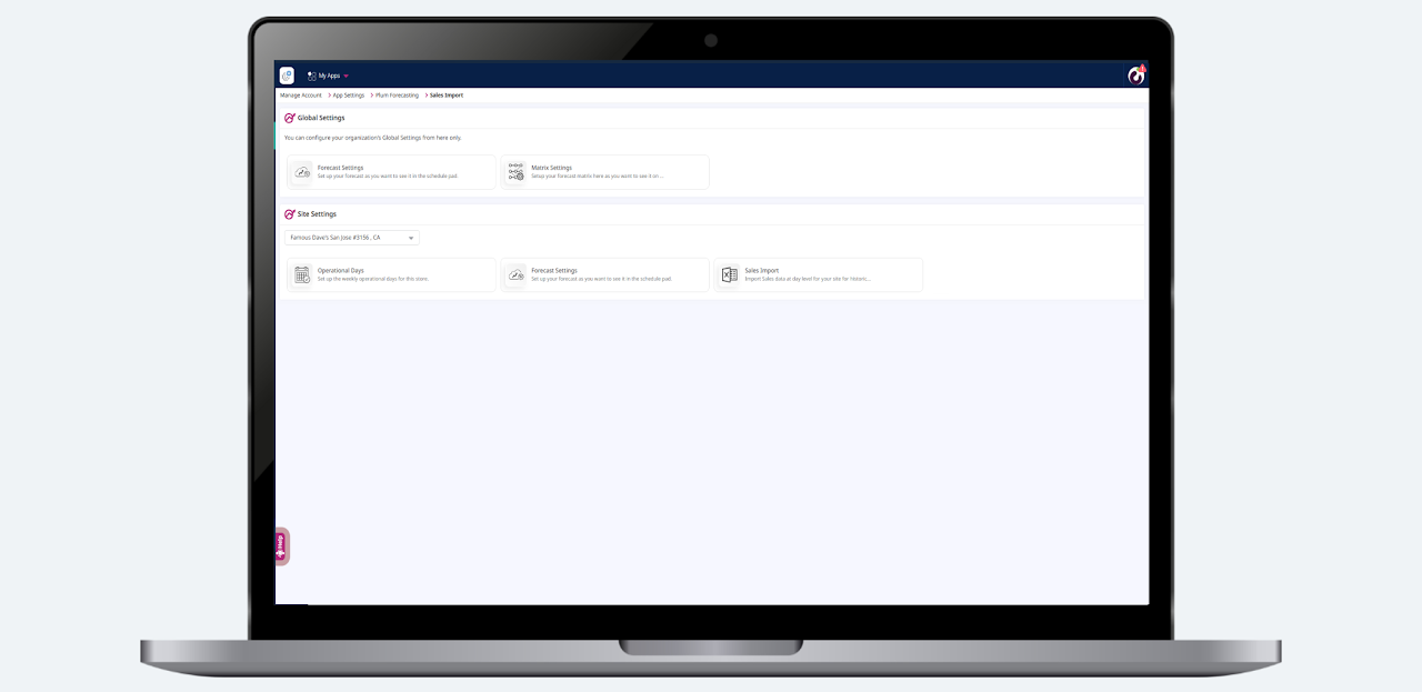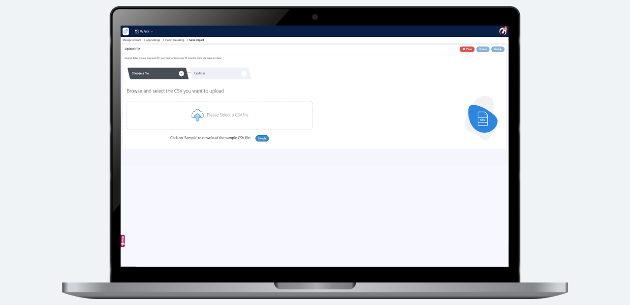 Step 9: In Settings >>Forecast Settings>>Site Settings, then click on the Sales Import module and select Import CSV.