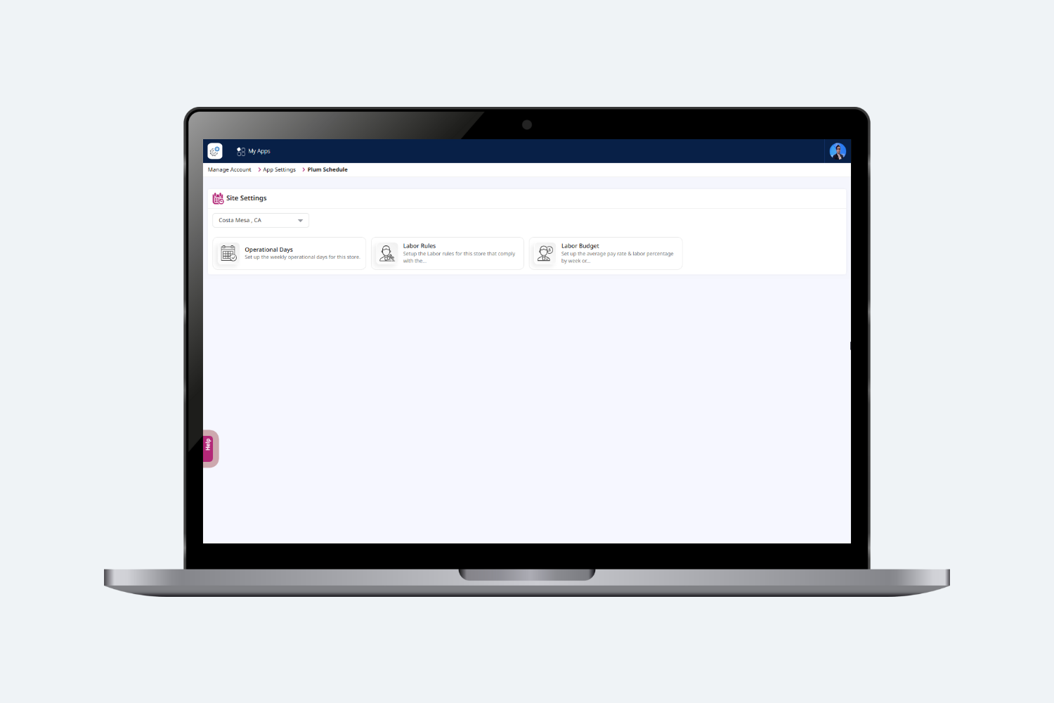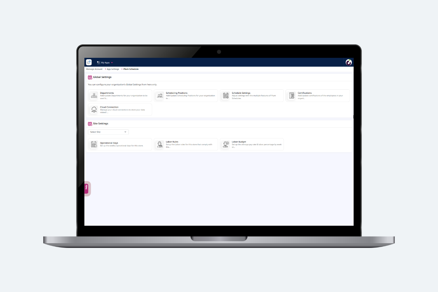 • Managers and Assistant Managers have limited access over the settings in Plum Schedules which include only the App Settings restricted to control only assigned sites, and personal settings such as profile settings.