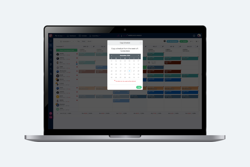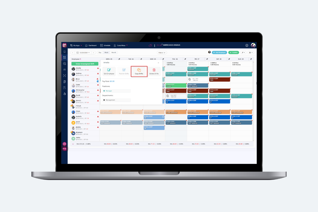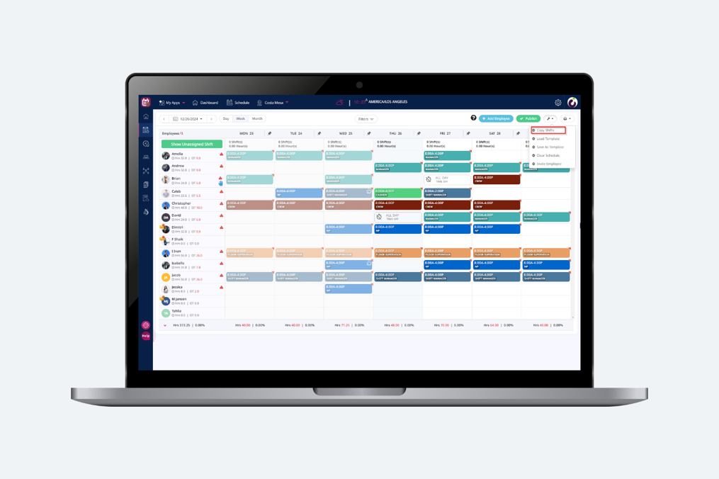 Users can view the copy shift option from the tool icon drop-down on the top-right side of the schedule pad, which will copy the selected week onto your current week’s schedule. Refer to the following image-